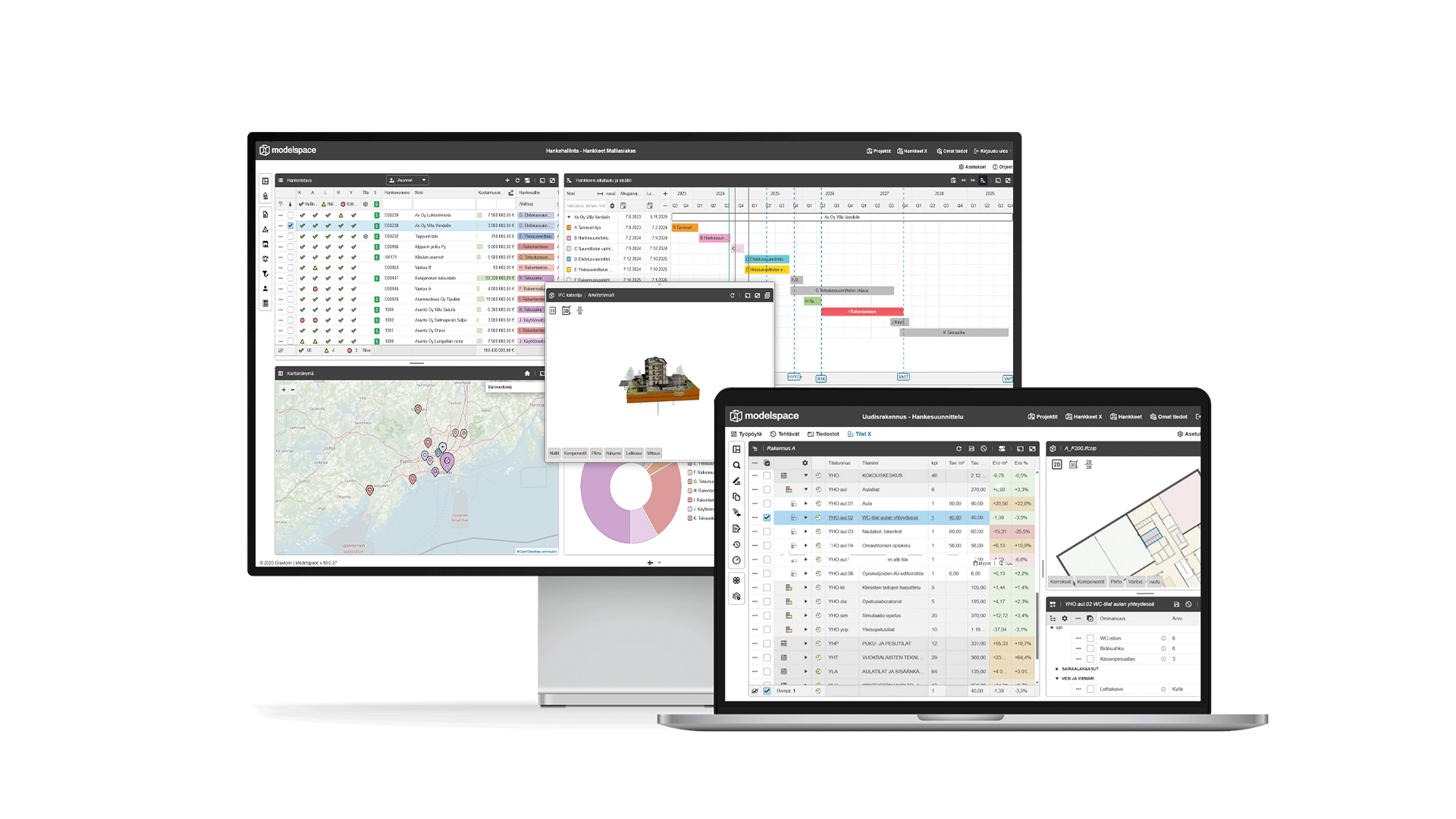 Modelspace ohjelmistoratkaisullamme tehostat kaikkia rakennushankkeesi vaiheita. Se yhdistää tiedot investointivaiheesta ja toteutuksesta käytön ja kiinteistöjohtamisesi tarpeisiin.